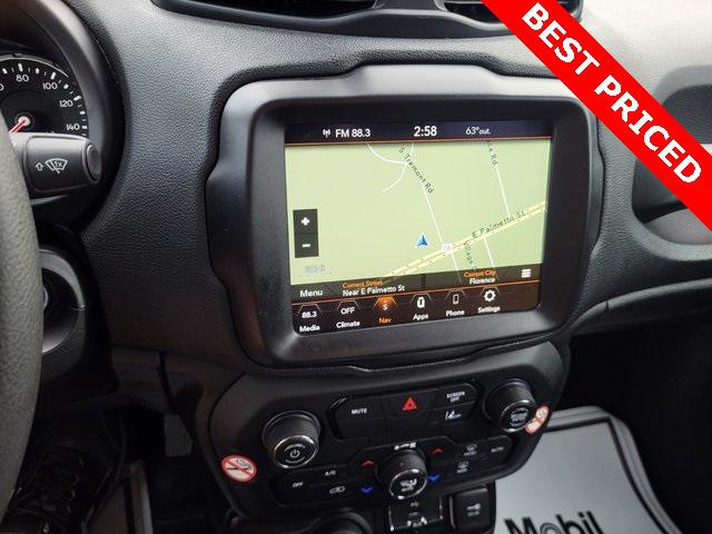 Priced below KBB Fair Purchase Price! Odometer is 4062 miles below market average!CARFAX One-Owner.Alpine White Clearcoat 2023 Jeep Renegade Latitude 4D Sport Utility 4WD 1.3L I4 9-Speed 948TE Automatic17"" x 7.0"" Aluminum Wheels 3.734 Final Drive Ratio 4-Wheel Disc Brakes 6 Speakers ABS brakes Air Conditioning Alloy wheels AM/FM radio: SiriusXM Anti-whiplash front head restraints Apple CarPlay/Android Auto Automatic temperature control Brake assist Cloth Bucket Seats Compass Delay-off headlights Driver door bin Driver vanity mirror Dual front impact airbags Dual front side impact airbags Electronic Stability Control Emergency communication system: SiriusXM Guardian Four wheel independent suspension Front anti-roll bar Front Bucket Seats Front Center Armrest Front dual zone A/C Front reading lights Heated door mirrors Illuminated entry Knee airbag Low tire pressure warning Navigation System Normal Duty Suspension Occupant sensing airbag Outside temperature display Overhead airbag ParkView Rear Back-Up Camera Passenger door bin Passenger vanity mirror Power door mirrors Power steering Power windows Quick Order Package 22B Radio data system Radio: Uconnect 4C Nav w/8.4"" Display Rear anti-roll bar Rear window defroster Rear window wiper Remote keyless entry Roof rack: rails only Security system Speed control Split folding rear seat Spoiler Steering wheel mounted audio controls Tachometer Telescoping steering wheel Tilt steering wheel Traction control Trip computer Variably intermittent wipers Voltmeter.Be sure to contact Internet Sales for details. CALL 843-292-8585. Proudly serving: Florence Sumter Darlington Marion Charleston Columbia Conway Camden Aynor Lake City Lakewood Conway Myrtle Beach Hartsville and all of greater South Carolina!